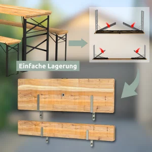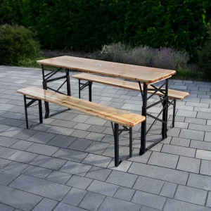 Unsere Bierzeltgarnituren bestehen aus robustem Holz, das für seine Langlebigkeit und natürliche Optik geschätzt wird. Das Set besteht aus einem stabilen Tisch und zwei passenden Bänken.