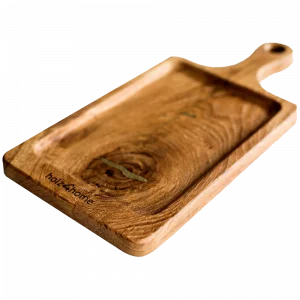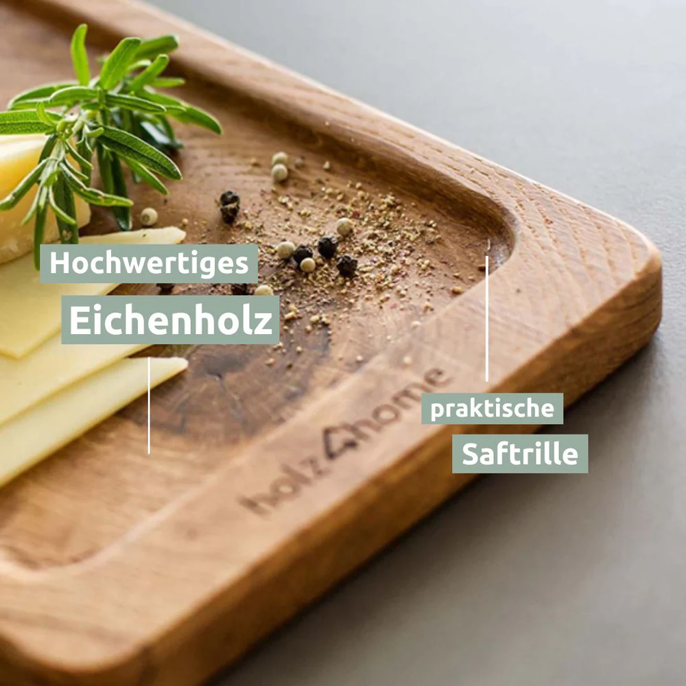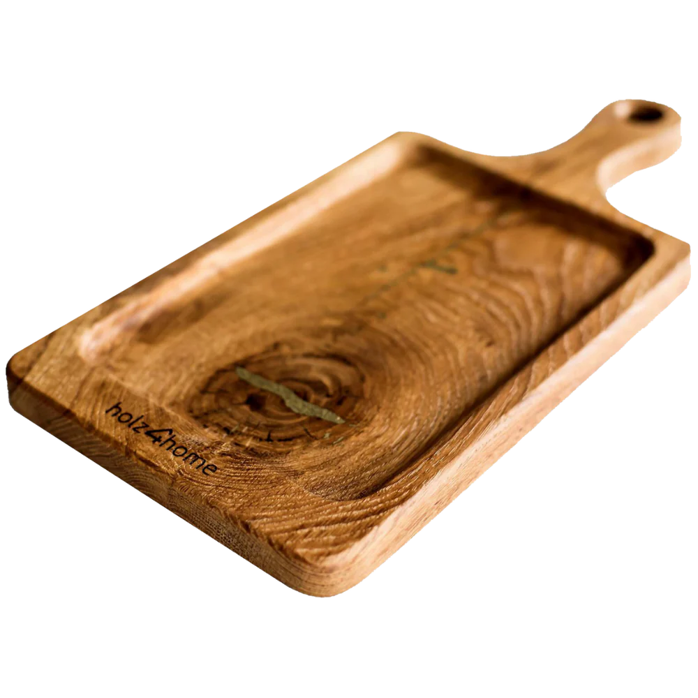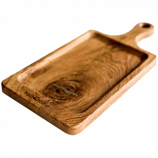Jedes Brett wird als Einzelstück in liebevoller Handarbeit gefertigt. Das Holz Servierbrett aus Eiche ist aus echtem thermisch modifiziertem Eichenholz gefertigt und von Natur aus antibakteriell.