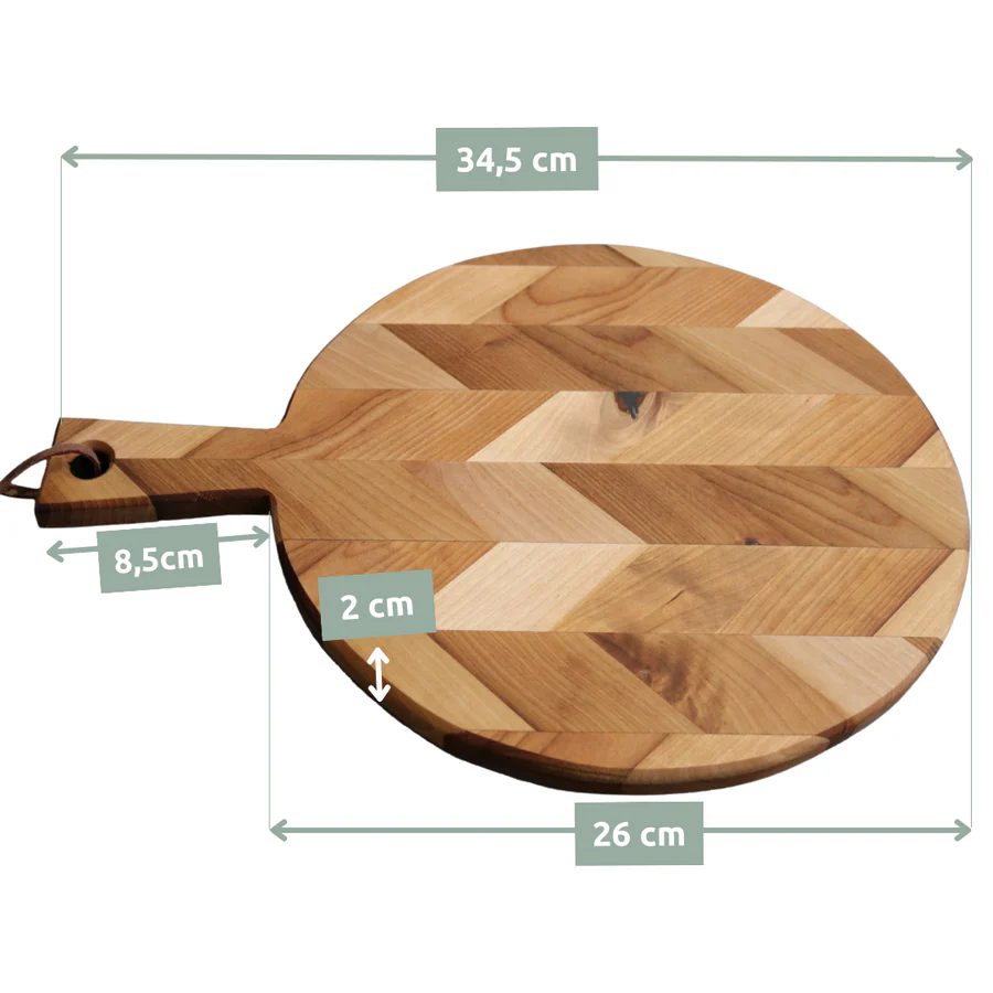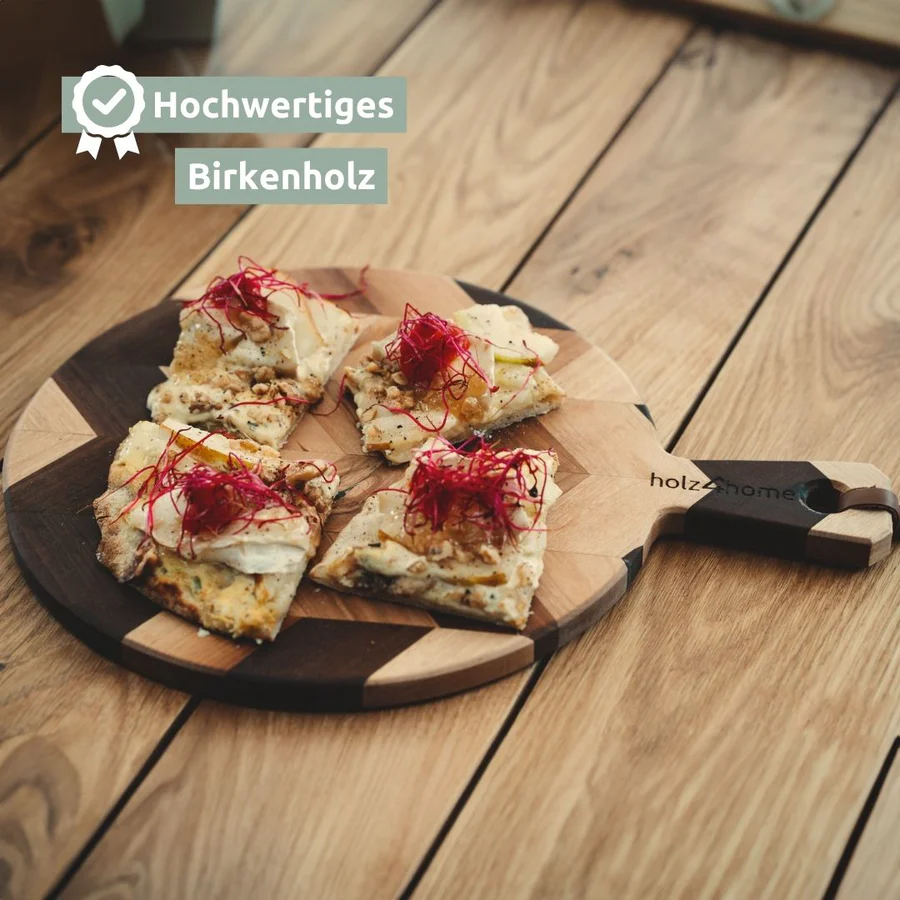- HOCHWERTIGE QUALITÄT: Jedes Brett wird als Einzelstück in liebevoller Handarbeit gefertigt. Das große runde Holz Schneidebrett ist aus thermisch modifiziertem Birkenholz gefertigt und von Natur aus antibakteriell. Durch die Verwendung von hochwertigem, massivem Holz ist das Küchenbrett besonders langlebig. Das originelle Muster im Fischgräten-Look sowie das Echtlederbändchen sorgen für eine auffällig schöne Ästhetik.