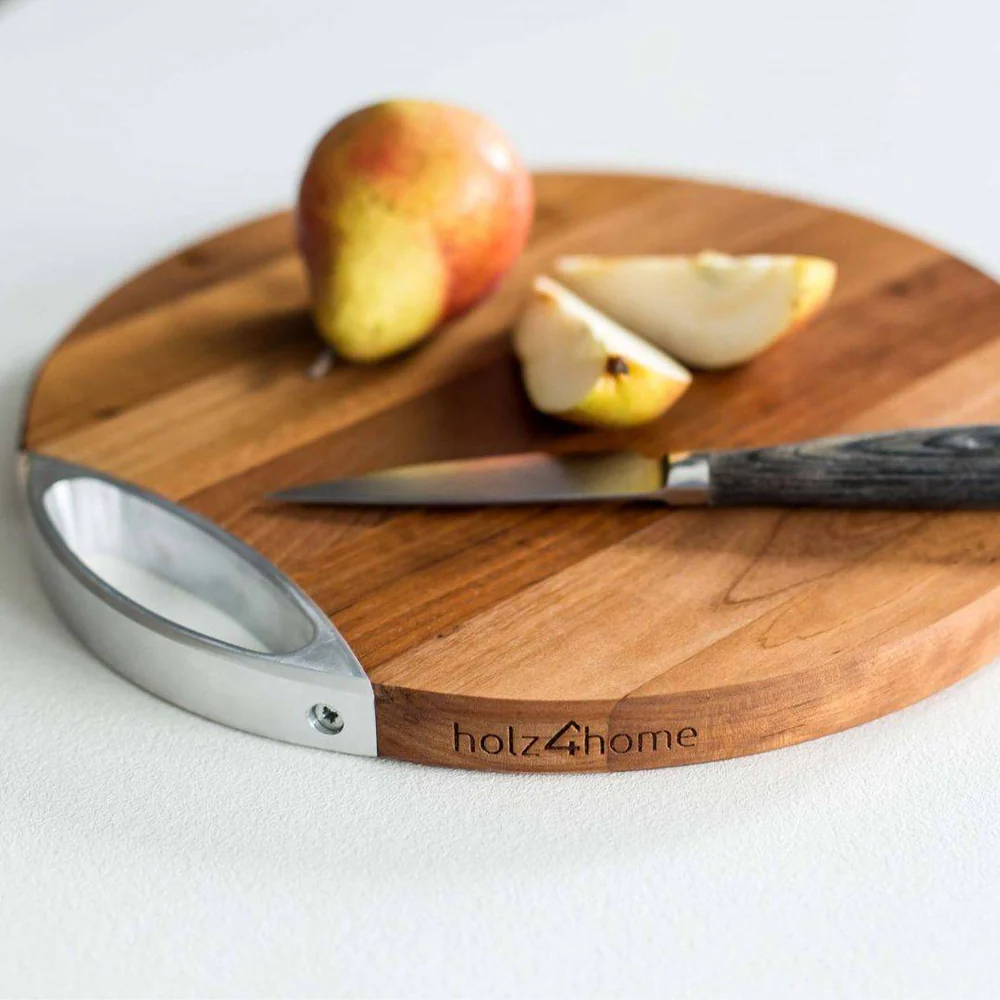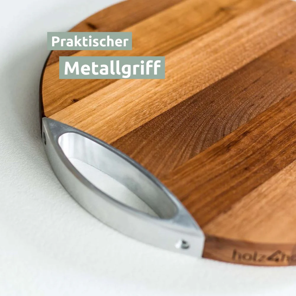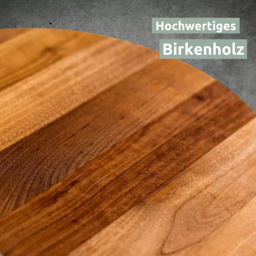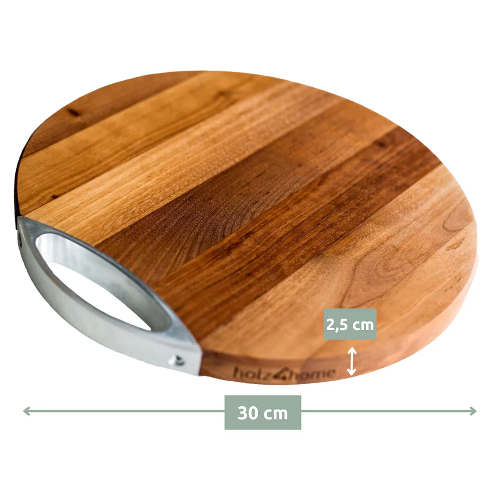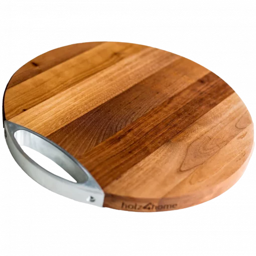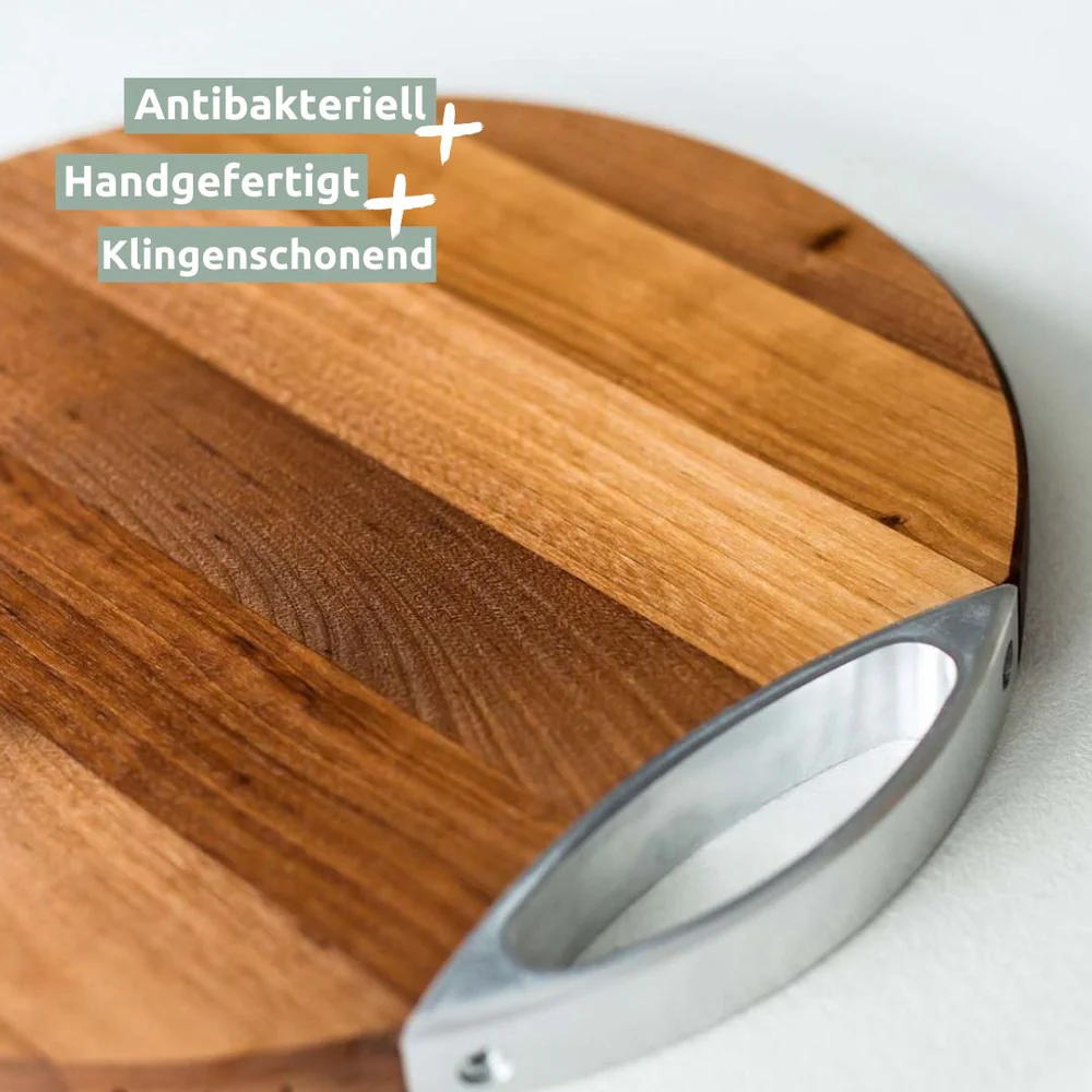 - HOCHWERTIGE QUALITÄT: Jedes Brett wird als Einzelstück in liebevoller Handarbeit gefertigt. Das runde Schneidebrett aus Birkenholz ist aus thermisch modifiziertem Holz gefertigt und von Natur aus antibakteriell. Durch die Verwendung von hochwertigem, massiven Holz ist das Küchenbrett besonders langlebig. Dank seiner angenehm glatten Oberfläche splittert es nicht und ist durch den praktischen Griff aus hochwertigem Aluminium einfach in der Handhabung.