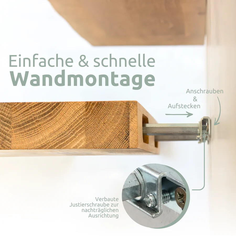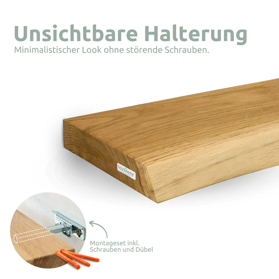 - MONTAGE: Mit dem mitgelieferten Montageset ist Dein Schweberegal im Handumdrehen montiert. Die Befestigung verschwindet im Holz und ist somit unsichtbar.