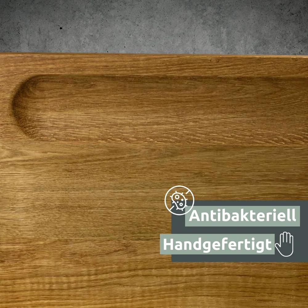Das Holz Servier- und Schneidebrett ist aus edlem europäischem Eichenholz gefertigt und ist von Natur aus antibakteriell. Durch die Verwendung von hochwertigem, massivem Holz ist das Küchenbrett besonders langlebig.