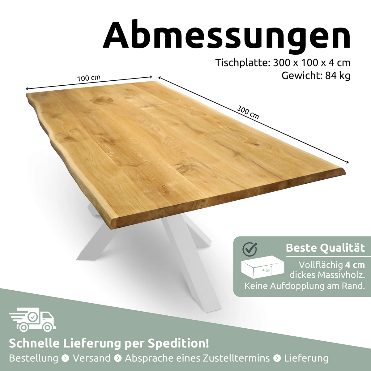 Ein Stück Natur für das Zuhause – Das ist im Falle unserer Massivholztischplatten nicht nur ein Sprichwort. Der Tisch aus massiver Eiche besteht aus Holz, das in großen Stücken aus einem Baumstamm gesägt und anschließend sorgfältig geschliffen und geölt wird. Dadurch erhält die Tischplatte ihre beliebte und formschöne natürliche Kante und die notwendige Stabilität, die ein Esszimmertisch aufweisen muss. Das strapazierfähige Eichenholz hält essen, toben und arbeiten aus und kann auch wunderbar als Schreibtisch für das Homeoffice oder Werktisch für den Hobbykeller genutzt werden. Dank der vielen individuellen Größen finden unsere Tischplatten in jedem Raum Platz! Keine Sorge, bei uns kannst Du Deinen individuellen Tisch zusammenstellen oder aber fertige Tischplatten inklusive Tischgestell kaufen.